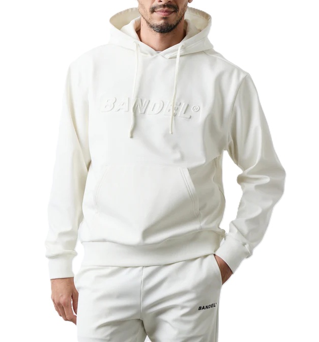 表地にやや光沢のある裏起毛素材を使用したプルオーバーフーディのフロントにエンボスロゴを施したシンプルなデザインはあらゆるシーンで活躍してくれること間違いなし。