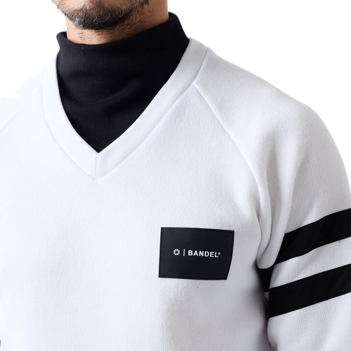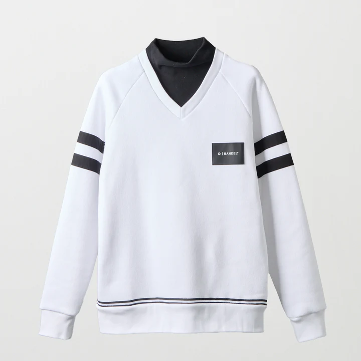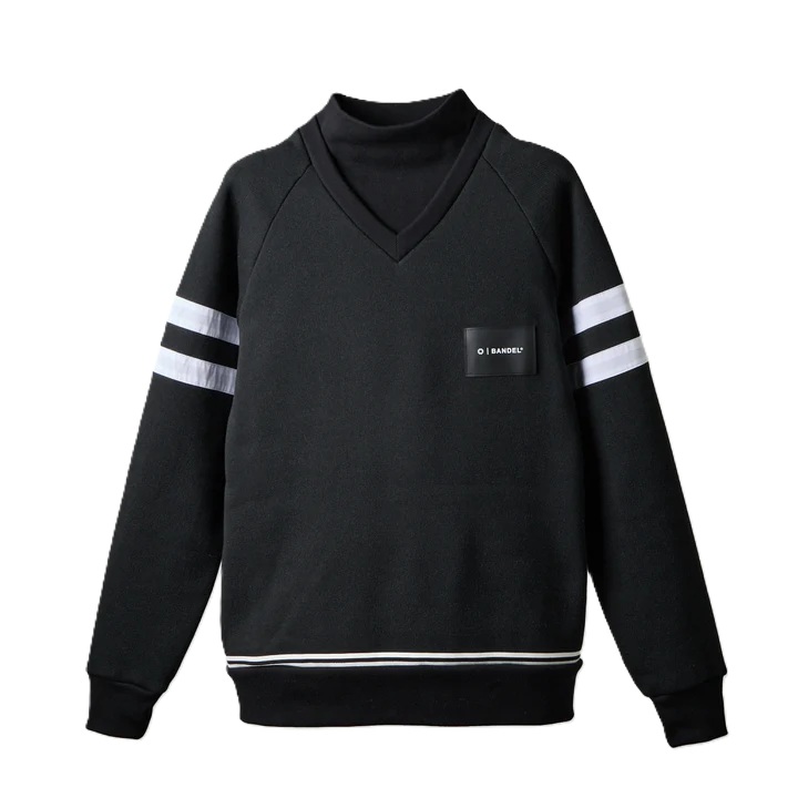 保温性の高いニットを使用したVネックニットに、光沢のあるリブハイネックをフェイクレイヤードしました