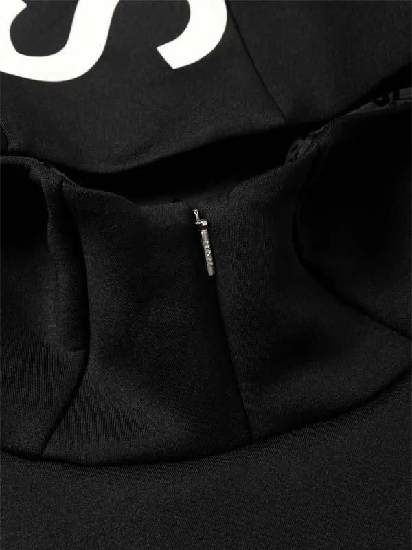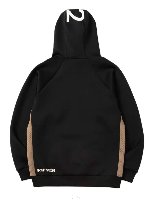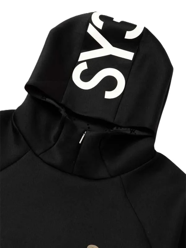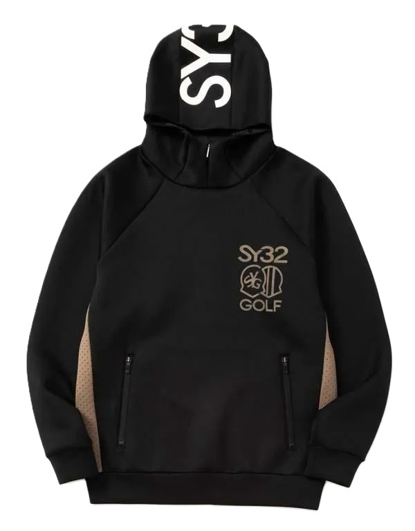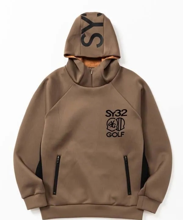 ソフトタッチのストレッチダンボール素材を使用したフーディー。フード部分はジップ付きのスタンドカラーを組み合わせたハイブリッドデザインを採用。左胸にはSY32のフロッキープリント。両脇下部分にはパンチング処理をしたダンボール素材を使用。