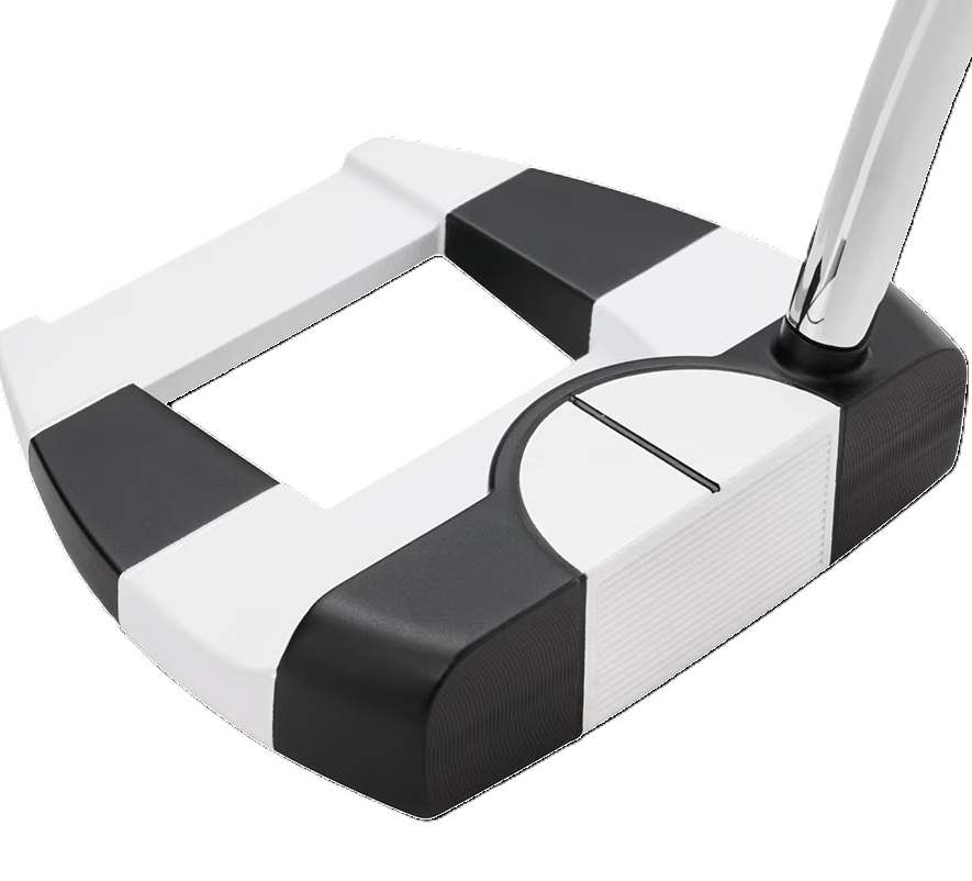 オデッセイの円を活用したアライメントに、全く新しいタイプが誕生です。新登場の「Ai-DUAL 1/2-BALLパター」では、2-BALLのように複数を並べたりするのではなく、逆にボール1個をカットして半分に!中央に入れられた黒い線も含めた曲線と直線の組み合わせが効果を発揮して、アドレス時にはボールのラインやターゲットに対するフェースのズレを簡単に認識できます。